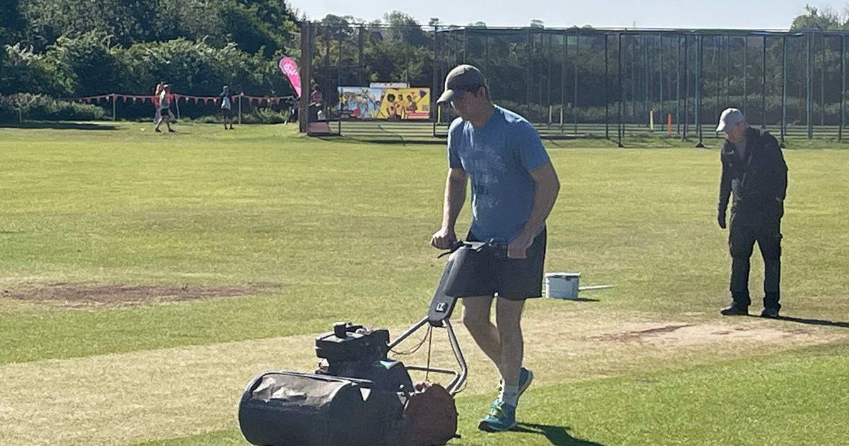 Pictured are two such volunteers for Haverfordwest, Ashley James, with the grass cutter and James ‘Tacky’ Marchant with the paint brush for the crease lines.