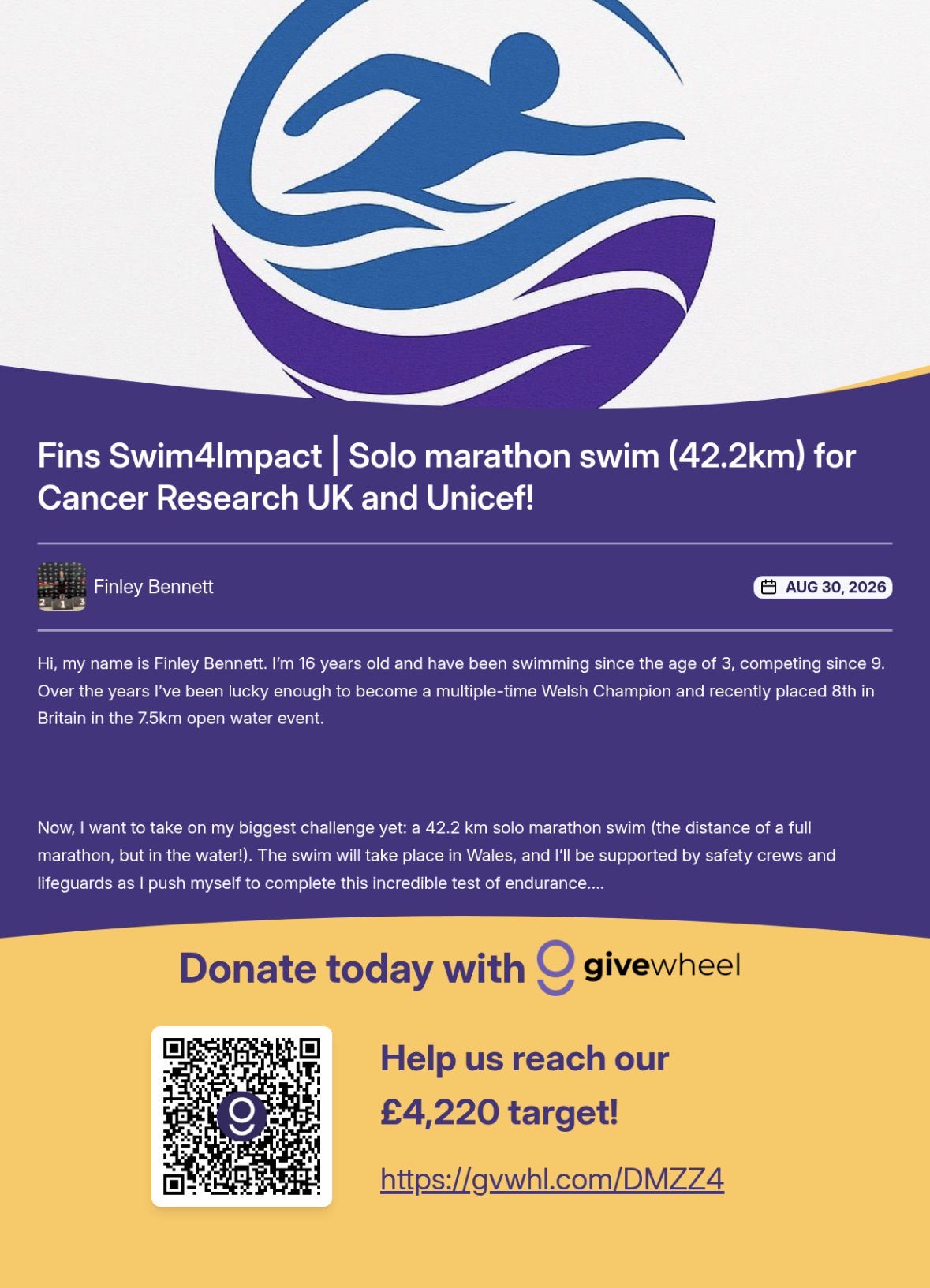To support Finley's challenge, visit his fundraising page at gvwhl.com/DMZZ4 or follow his journey on Instagram @fins.swimforimpact.