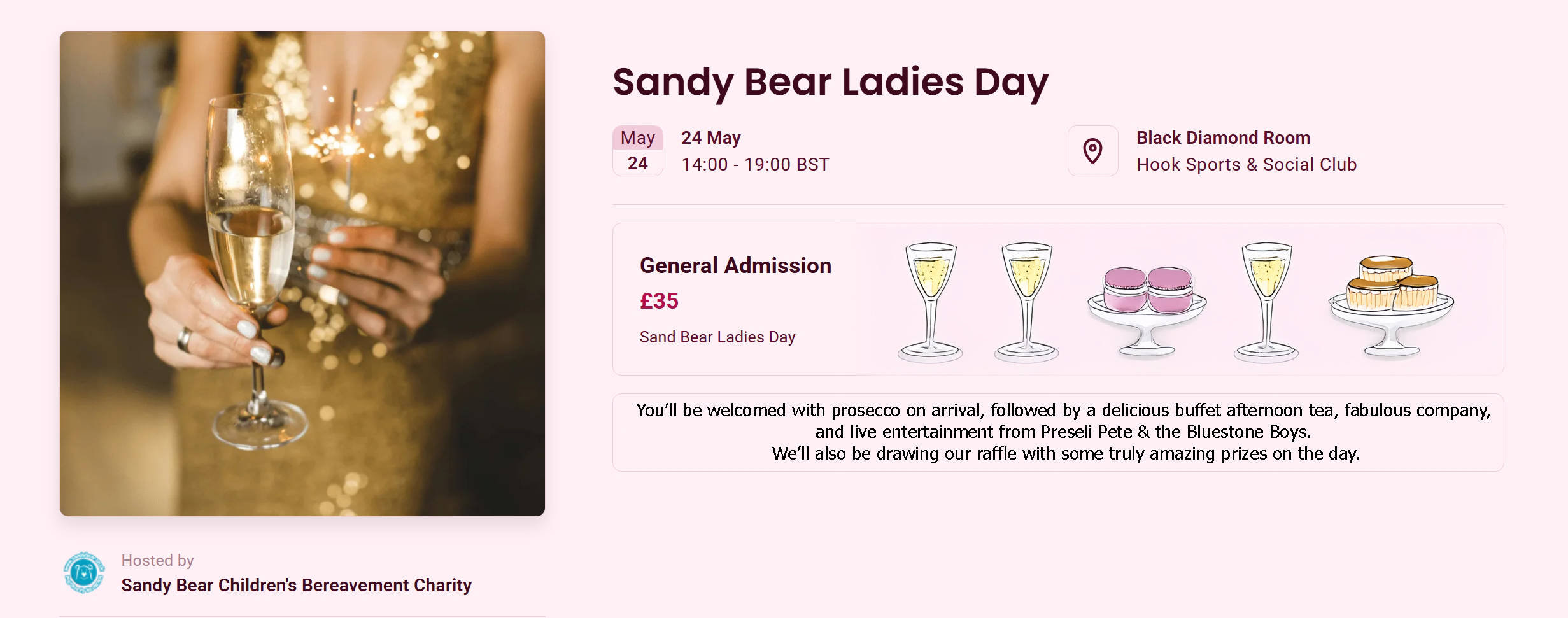 Tickets went on sale this week, and every penny raised will go directly towards Sandy Bear’s bereavement support services, which now support thousands of children, young people and families each year across Pembrokeshire and wider Wales.